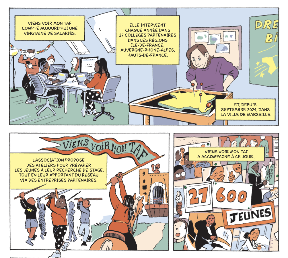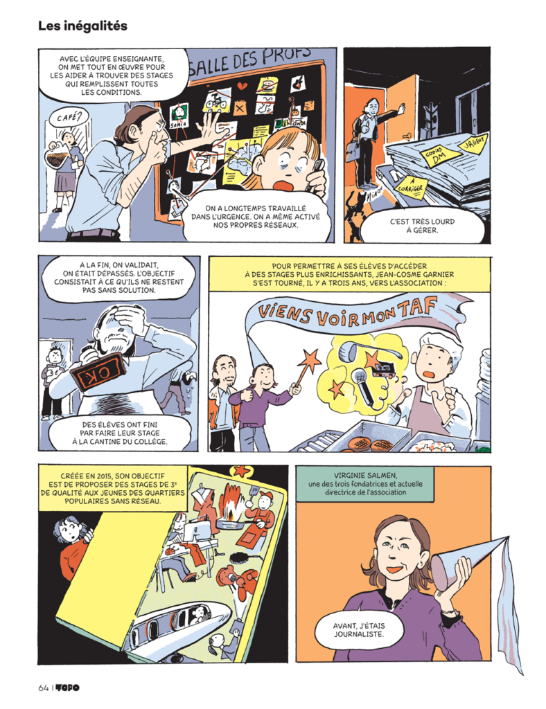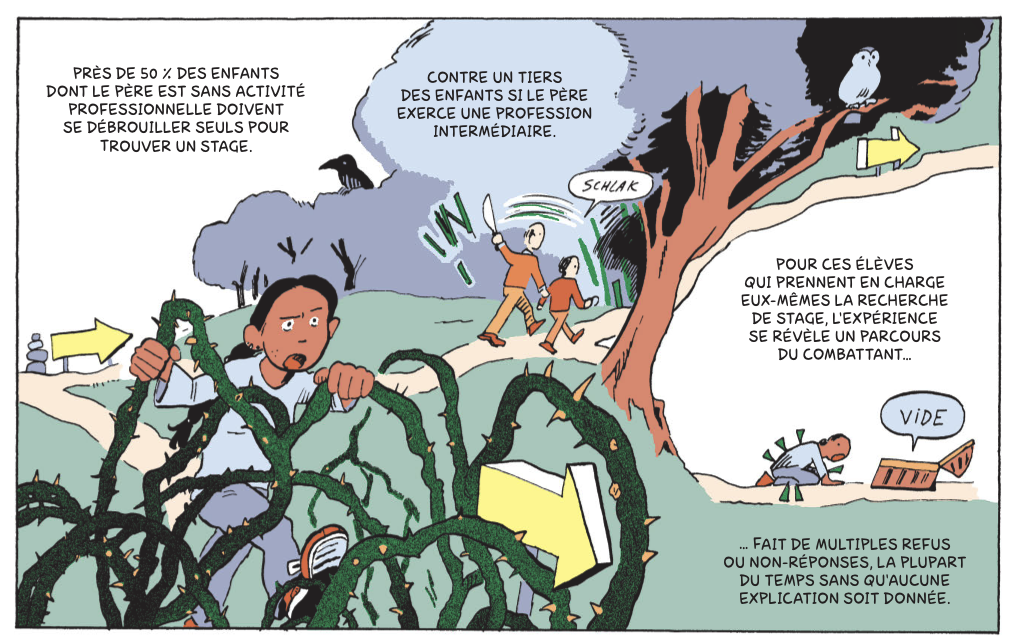 La revue TOPO consacre une BD à la difficulté des élèves des quartiers populaires à trouver un stage de 3e. Faute de réseau, avec une distance géographique et sociale accrues, ils peinent à trouver un stage qui aille dans le sens de leurs souhaits d’orientation. Et pourtant l’ambition chez beaucoup de jeunes est là !