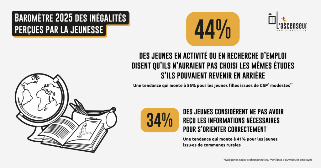 Le collectif de L’Ascenseur vient de dévoiler les résultats de la 2ème édition du Baromètre des inégalités ressenties par les jeunes. Parmi ses grandes thématiques : les inégalités perçues en matière d’éducation et d’insertion professionnelle, avec des chiffres choc qui obligent à regarder la réalité en face :
