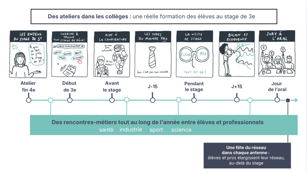 À ViensVoirMonTaf, une équipe formée et dédiée accompagne les élèves, dès la 4e, et leur offre jusqu’à 10 rencontres dans l’année : des ateliers d’outillage concret en classe au collège, des rencontres-métiers avec des professionnels et des visites d’entreprises. Car oui, cet accompagnement est le gage d’un stage de 3e réussi et accompli !